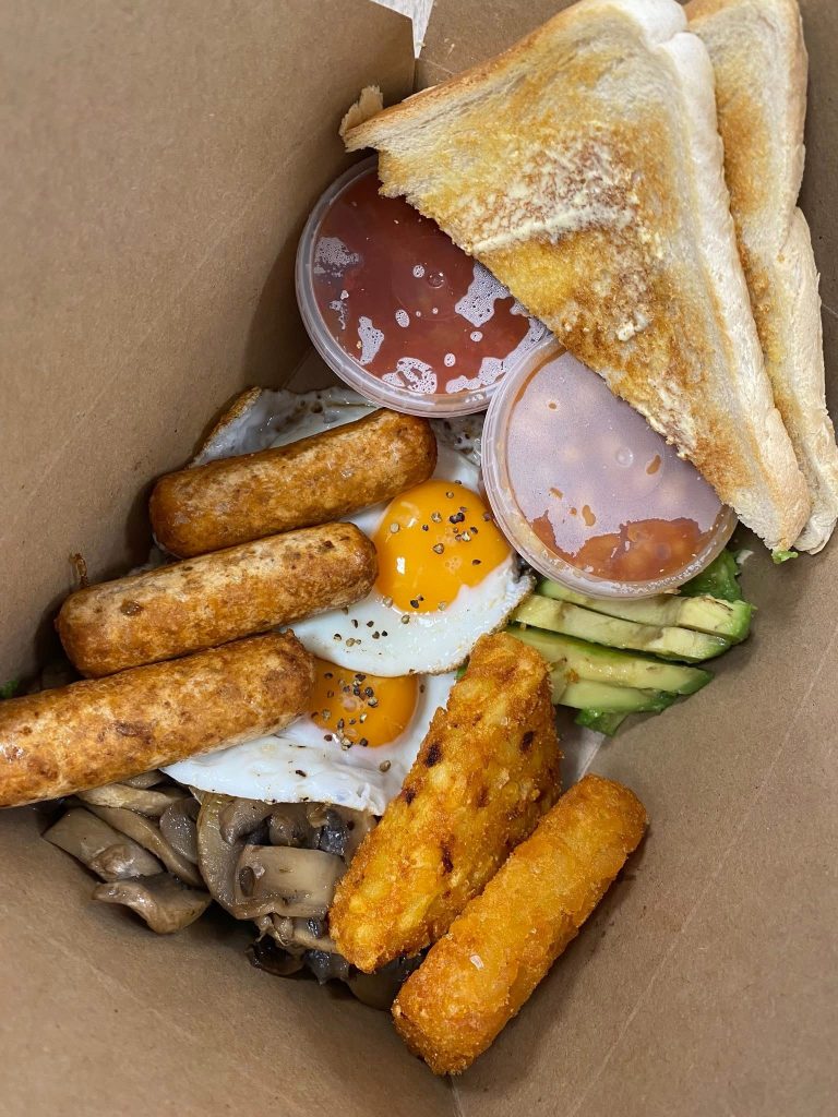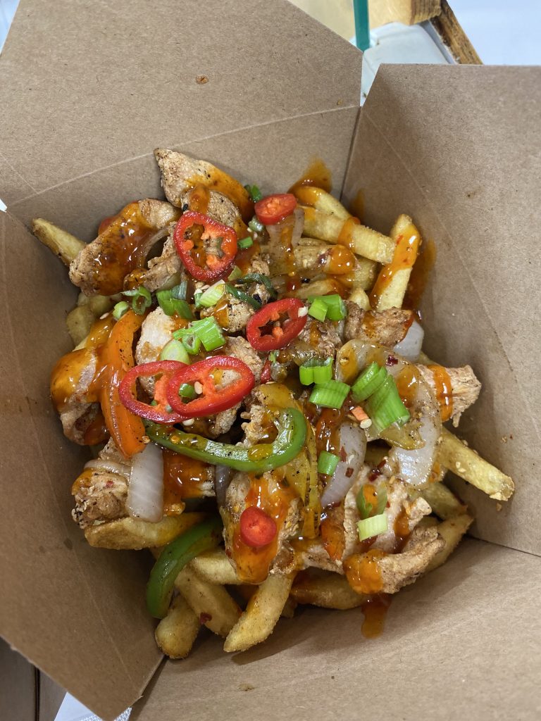 Greek style baked chicken, rice, onions, cucumber, tomato, olives and tzatziki sauce.